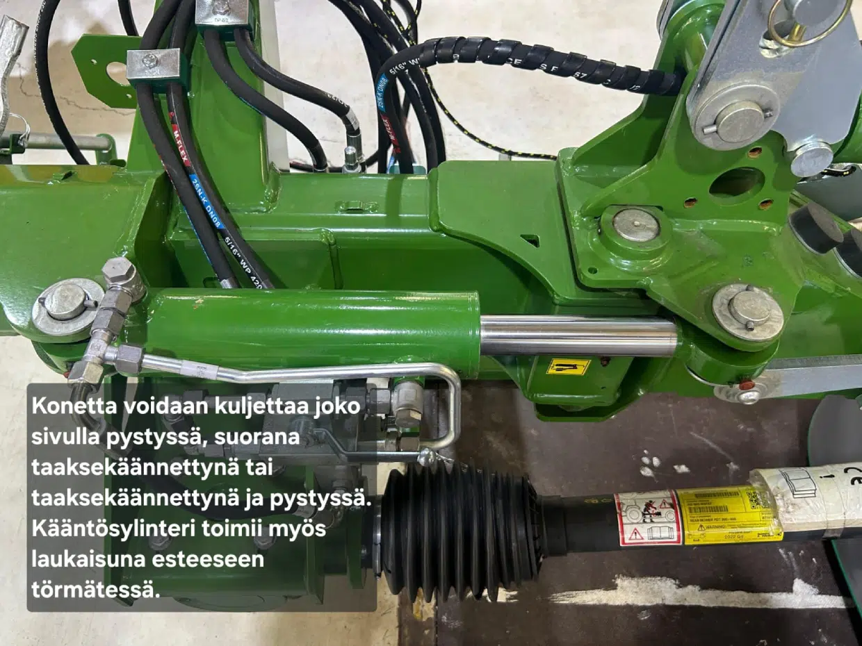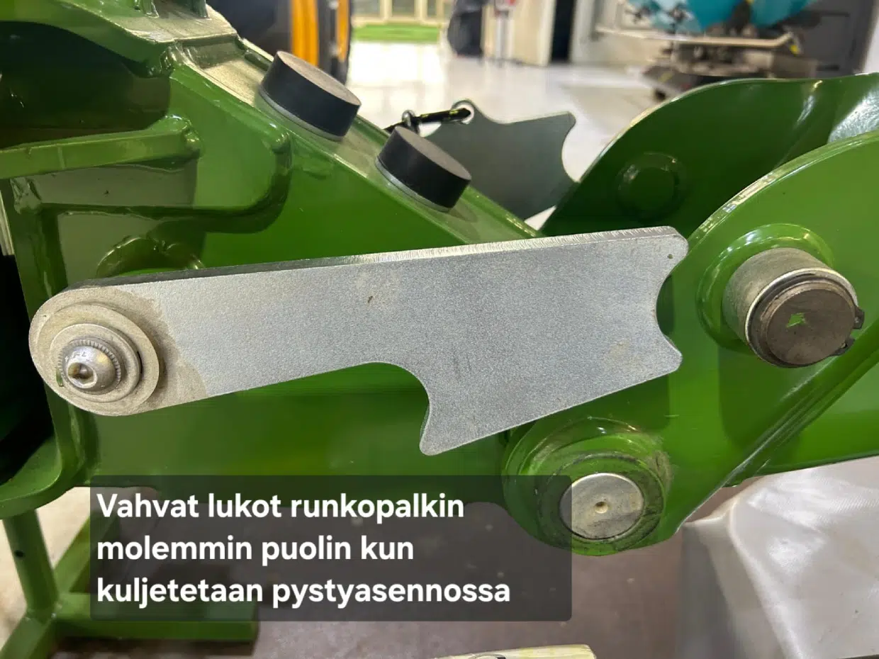 Kääntösylinteri toimii samalla laukaisuna esteeseen osuessa. Kone väistää siis esteen ylös ja tarvittaessa taakse. Pystykuljetuksessa runkopalkin molemmilla puolilla olevat lukot pitävät koneen asennon vakaana.
